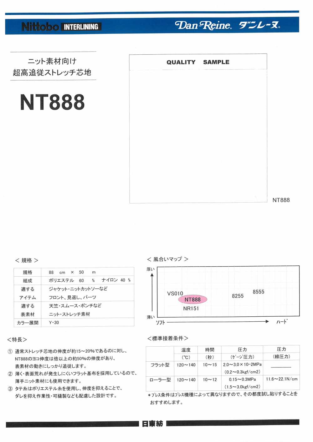 ①通常ストレッチ芯地の芯地の伸度が約15%〜20%であるのに対し、NT888のヨコ伸度は倍以上の約50%の伸度があり、表素材の動きにしっかり追従します。