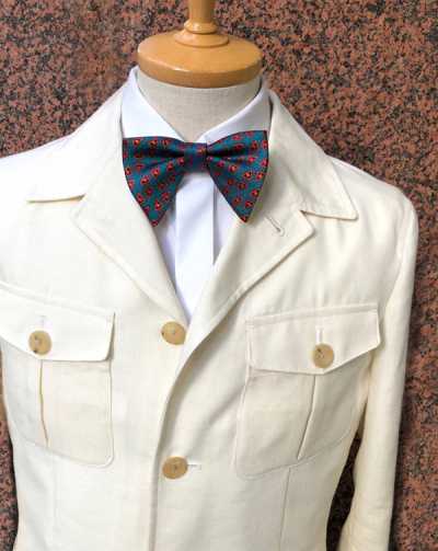 270年以上の歴史を持つ英国のシルク生地メーカーVANNERS社でオリジナルで織った高密度のシルク生地を使い、国内の蝶ネクタイ専門ファクトリーで製作した蝶ネクタイです。